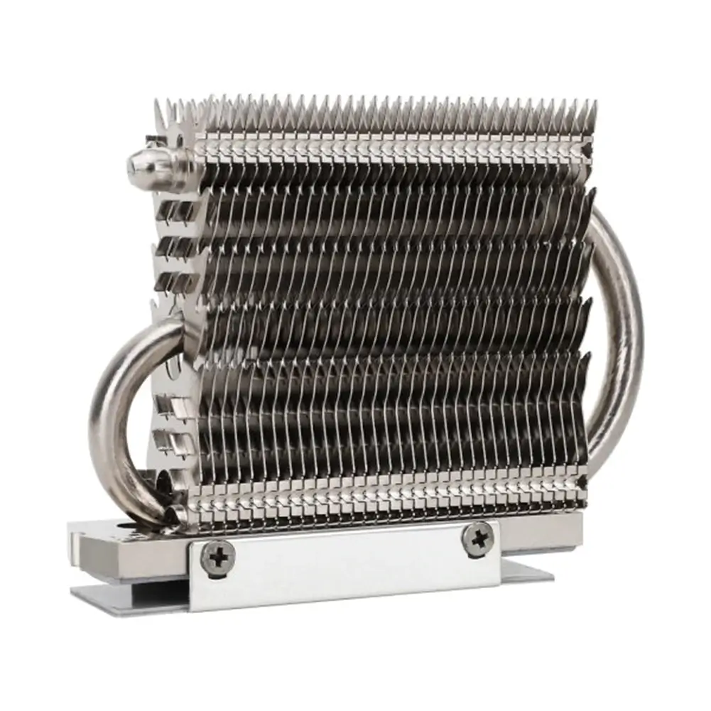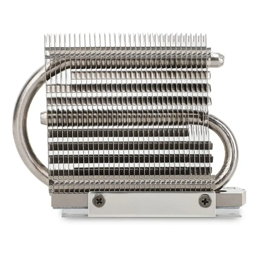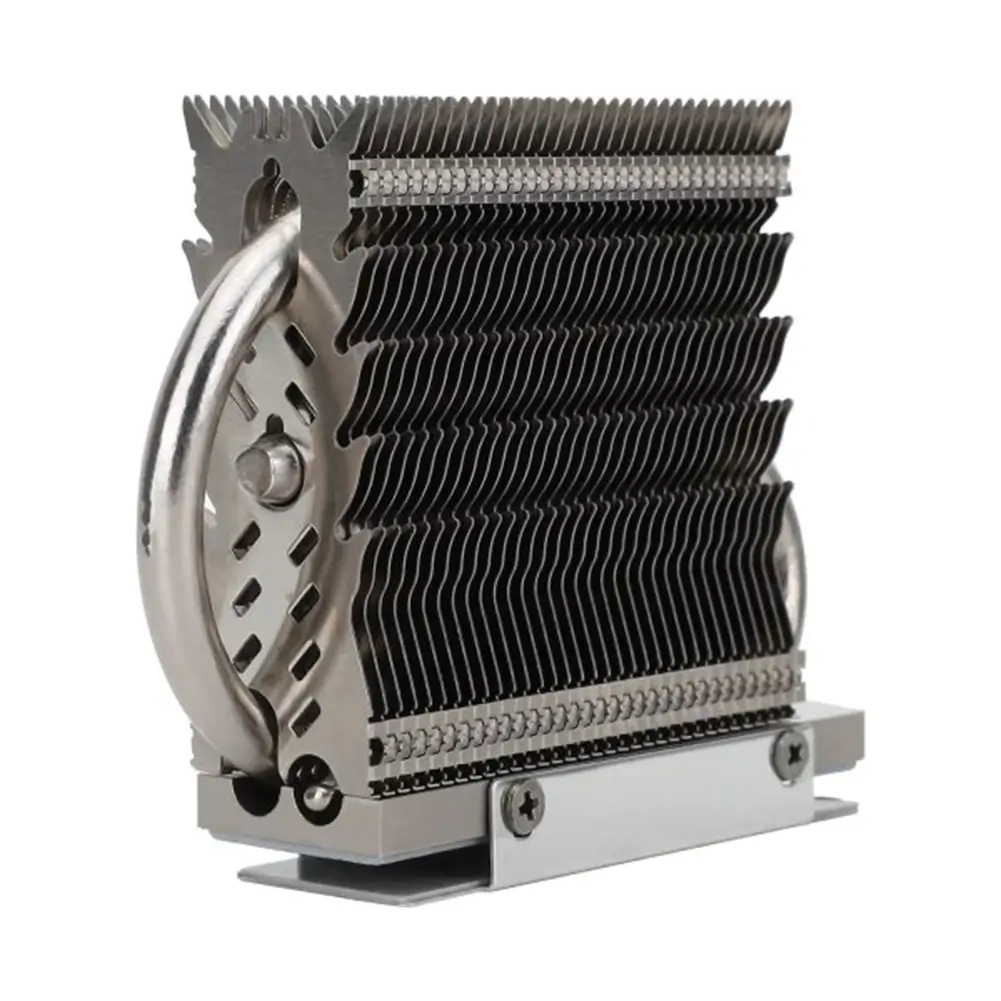 Ten pasywny radiator dla dysków M.2 jest bogato wyposażony w elegancko wyprofilowane żeberka aluminiowe przez które przechodzą 2 rurki cieplne (heat pipe). To wszystko przymocowane jest do porządnej aluminiowej stopki, dzięki czemu odprowadzanie ciepła jest na bardzo wysokim poziomie.